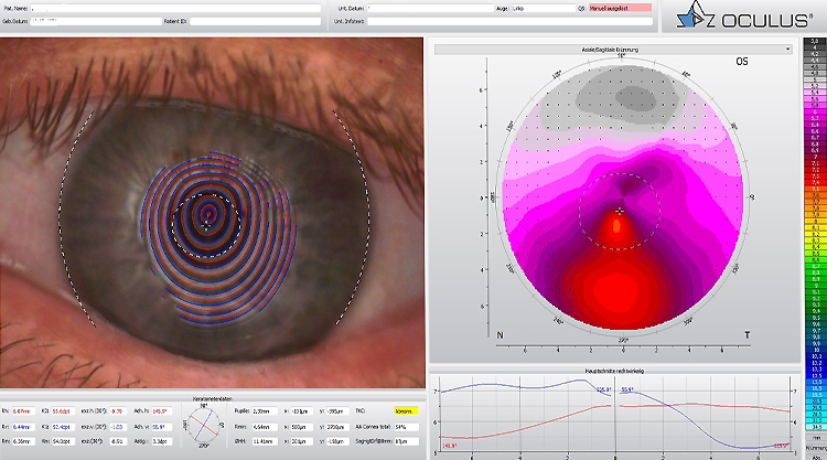 Unsere Pentacam ist eine rotierende Kamera, welche Ihr Auge im Querschnitt darstellt. Es erfolgt ein Screening des gesamten vorderen Augenabschnitts in weniger als 2 Sekunden.